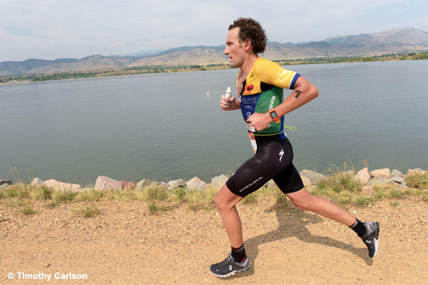 After 35 miles of the bike leg, Bozzone led Chrabot by 4 seconds and the trio of O’Connell, Collington, and Laundry by a little under 2 minutes. Not entirely out of contention were McKenzie, Kennett Peterson and Reid at 4:44 through 4:48 arrears. After a race-best 2:05:18 bike split, Bozzone led Chrabot (2:05:34 split) by 17 seconds, Laundry by 1:33, O’Donnell by 2:24, and Collington by 2:37.