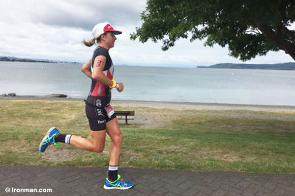 Halfway through the bike leg, Siddall led by 1 to 12 seconds on a close bunch including Watkinson, McCauley, Kraal, Cross, Dennis, Wilson, and Pomeroy. After a women’s-best 2:22:50 bike split, Watkinson led into T2 by 28 seconds on Siddall, 51 seconds on McCauley (the reigning Ironman New Zealand champ), 1:51 on Dennis, 2:09 on Christine Cross, and 3:35 on Pomeroy.