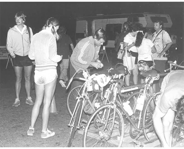 DE No follow van, no outside assistance. I had spokes taped to my seat stay. We all had tools with us. This was the first year for all of us, Molina, Tinley, Mark Montgomery who is my next door neighbor, we all have stories about the stuff we took. Molina had a water bottle cage on his handlebars with a jar of honey, and he drank the honey for fuel. I don’t know if you remember, he got off the bike 2nd or 3rd, and was chasing John Howard, running 6 minute miles for the first 6 miles, and then fainted dead out and collapsed. I don’t know if it was the honey.