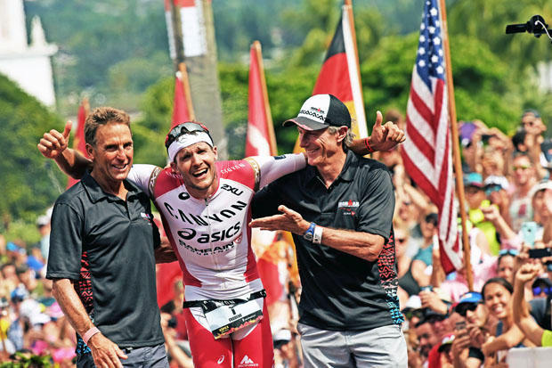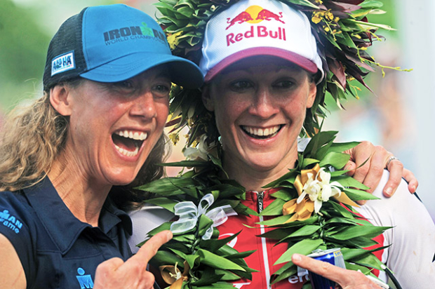 Retired four-time Kona winner Chrissie Wellington points to three-time winner Daniela Ryf at the finish.