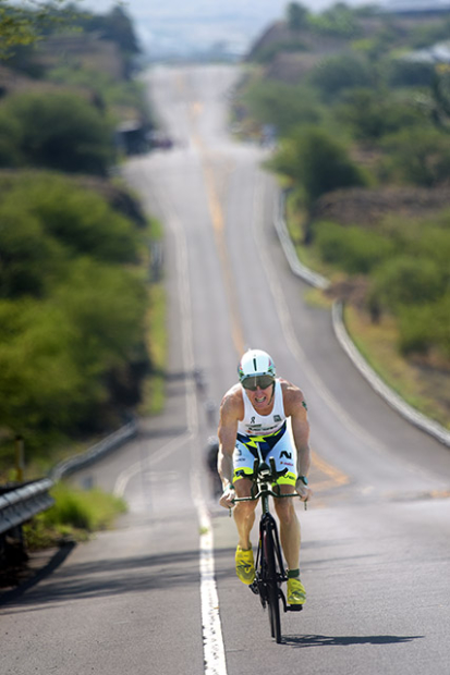 Kyle Buckingham of South Africa rides up steep hill at Ironman World Championship in Kona. Buckingham rode 4:50:12 on his way to 27th place.