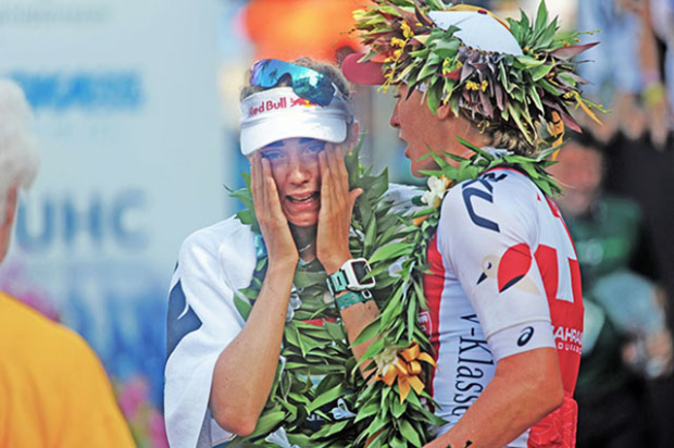 Lucy Charles sheds tears of happiness as she is congratulated by winner Daniela Ryf.