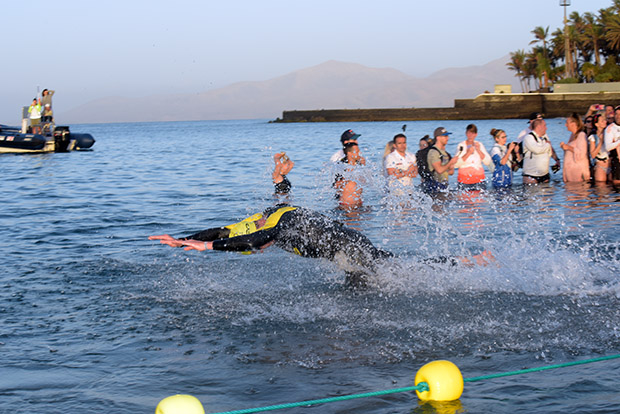 Swimmer dives at start of second lap at Ironman Lanzarote.