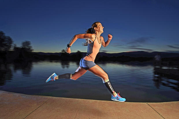 Holly Lawrence takes in a Clif Bar gel while running to victory at Oceanside 70.3.
