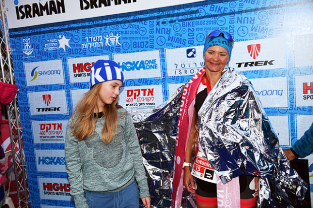 Antonina Reznikov of Israel celebrates her 2nd Israman 226 win with her daughter.