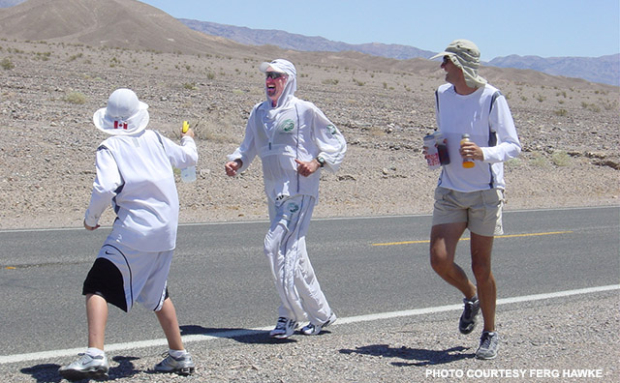 Ferg Hawke is cited in Wikipedia as “a leading international ultra-distance runner.” Starting in his 30s and still going at age 60, Ferg hauled his lumberjack-large frame to obscure ultras like Chuckanut, Kneeknacker, Elk Beaver and Eagle Run as well as star turns in legendary venues. At age 46 in the 2004 Badwater 135, Ferg finished second, 7 and a half minutes behind the renowned Dean Karnazes. Ferg scored an 8th place finish at the 2002 Marathon des Sables (at the time the highest placing and fastest time by a North American competitor) and in 1999 he finished third at the Ultraman Triathlon World Championship.