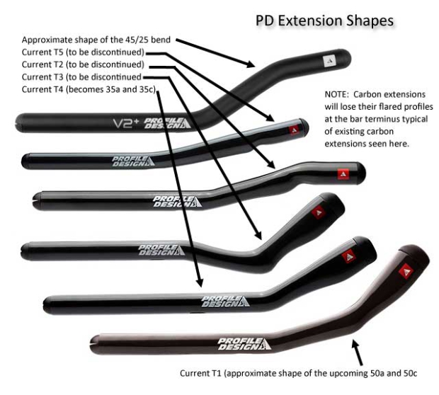 The best shapes are the last 3. The T3 is my favorite. But it’s also going away! My guess is that after this year – or sometime this year – that extension shape will be discontinued. So, if I was a bike fitter, or a bike shop, I’d try to buy a bunch of those. The T4 and T5 are both standard race or J or ski bends, just, the J5 is a flatter upturn (not as much upturn). I like them all. These shapes will be gone by the Fall, and will be replaced by three new shapes, which are approximately those in the image below.