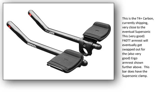 The Sonic aerobar is in stock now. The Subsonic lands in the U.S. on May 10th. The Supersonic is morphing as we speak: If you buy a T4+ Carbon right now you’re buying the Supersonic bracket. The extension on that bar will undergo a very minor change, a few degrees in the bend. The armrest today is the F40TT, but 6 or 9 months from now the Ergo armrest will start to show up on that bar.