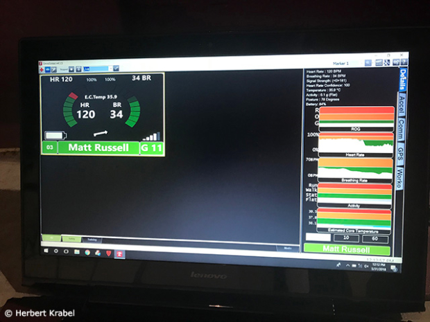 The Zephyr Bioharness is analyzed by Omnisense software, and the data is collected live via an Echo gateway Bluetooth transceiver.
