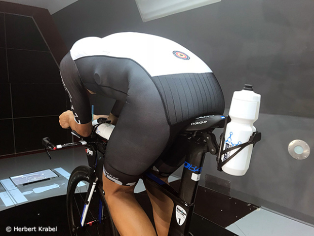 Since the bottle in the cage was faster, the attempt was made to bring the whole setup higher, but that ended up being slower for Matt Russell.