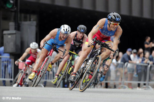 Martin Van Riel of Belgium, who took 5th place at WTS Leeds last weekend, led the men out of the water with a 9:01 split followed closely by Jonas Schomburg of Germany and Tyler Mislawchuk of Canada. The trio tried to make a break at the beginning of the bike leg, but they were soon reeled in by a massive horde.