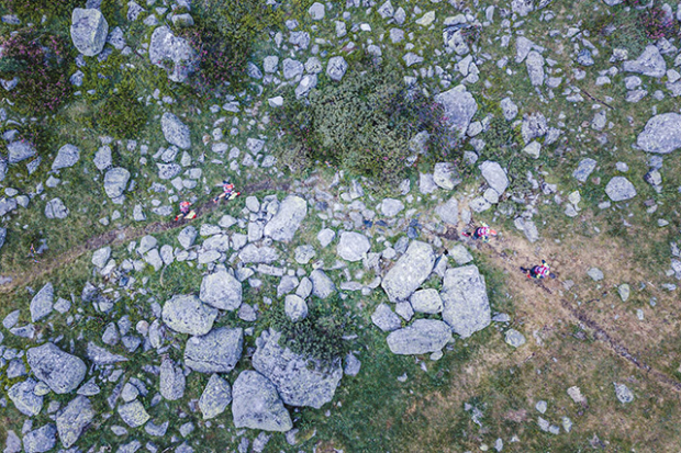 The view from above shows a couple teams navigating through the tricky terrain of that second running section.