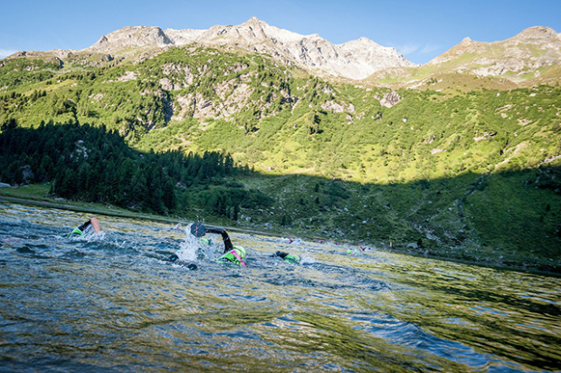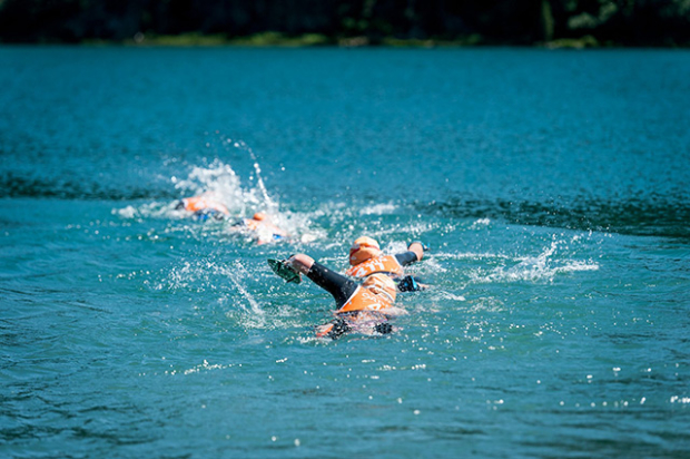 The first swim of the day is high up on the mountain and this lake is very cold. But the teams first run up a few miles to that lake and thus they are plenty warm when they enter the water, and this swim is only 270 meters long.