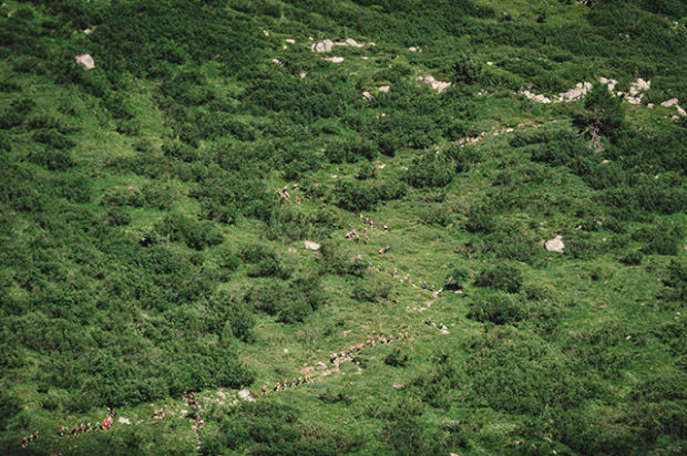 Teams are spread out all over the mountain and this narrow goat path above the lake is technically very challenging. First you go up and up and then you have descend on a very tricky narrow trail. Good times by all.