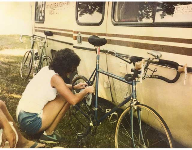 How about a way to rest the top half of your body on the front of your bike? Richard is more well known for these first aerobar designs that Elliott used during the 1984 RAAM, and he helped Pete Penseyres with a design of bars that Pete used when he set the RAAM average speed record that stood for a quarter century. The kind of aerobars we use today debuted only after the RAAM rides of Elliott and Penseyres. If you look very closely you can see some protrusions out the back of the road bars on Elliott’s bike (below) with some pads at the end on which he could lay his elbows.
