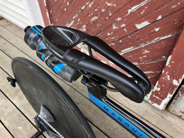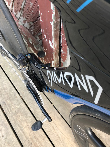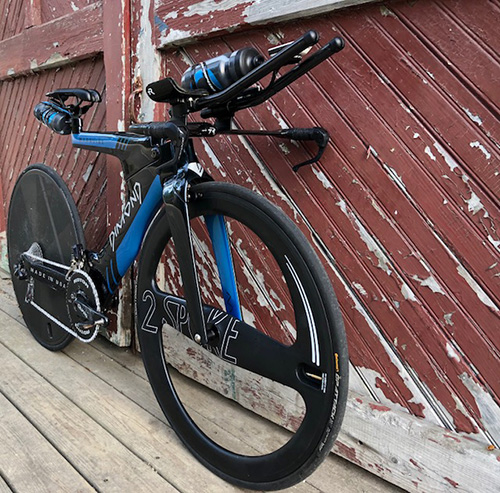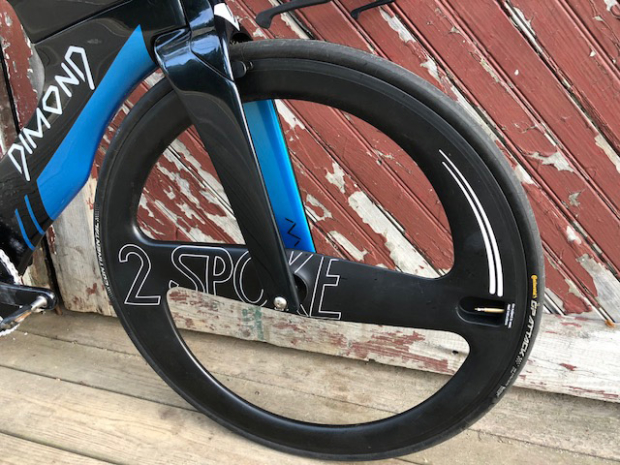 The M5 2 Spoke front wheel is not very common and it looks great on this Dimond Marquise. "I learned about Two Spoke from the forum. I thought it just looked awesome and it seems like a great match for the Dimond frame. After I got the wheel I did some very rudimentary aero/roll down testing comparing it to an ENVE SES and couldn't notice a difference. My first race on it was at Ironman Cartagena 70.3 last December, I had the fastest bike split in the M35-39, which I'd never done at a WTC event before, so I'm happy with it from a performance standpoint. Unsurprisingly, the wheel attracts a lot of attention," said Lambi.