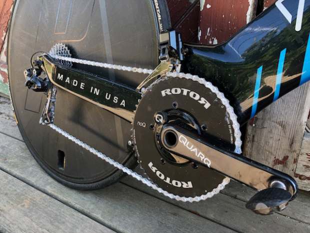The 170mm Quarq crank and 52/36 tooth Rotor chainring combination was chosen by Lambi because it had tested well in the Dimond Marquise wind tunnel tests. "I haven't bought in to the short crank wave I guess," added Lambi. The rear wheel is a Dash Cycles Disc, chosen by him because it can be used tubeless. Drivetrain is all Dura-Ace Di2 and the rear derailleur has SLF motion pullies. The BB is by CeramicSpeed