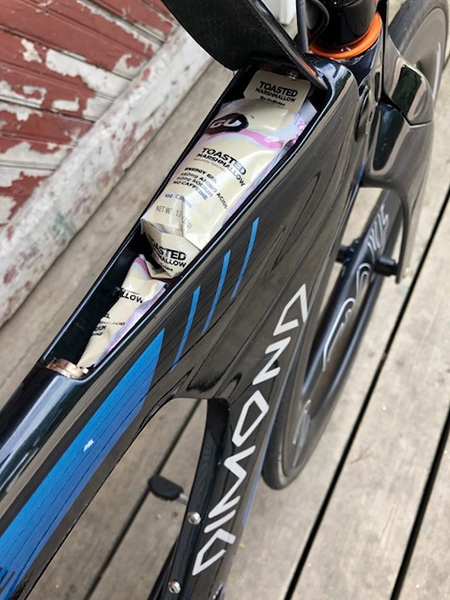 The top storage unit is stuffed with GU gels.
