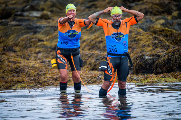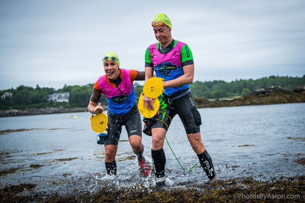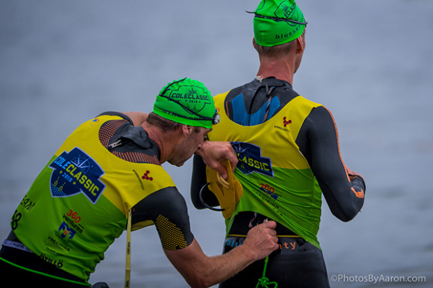 Nate Larlee hooks up to Thad Ingersoll before tackling another challenging swim. Larlee is racing at ÖTILLÖ Worlds next month with Casco Bay Islands men’s winner John Stevens.