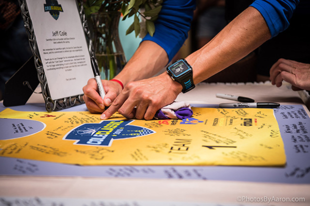Earlier athletes signed a golden bib jersey number 1 as a gift to the family of race founder Jeff Cole.