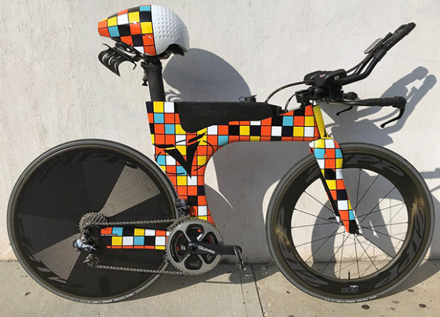 Greg Close is a professional triathlete and coach who races on this very distinctive checkerboard Ventum One, and as it should be – he also has a matching helmet. Being stylish while doing your job is well appreciated.
