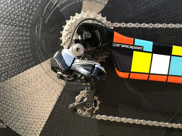 CeramicSpeed coated titanium pulleys and a CeramicSpeed UFO chain on the Dura-Ace Di2 rear derailleur. The rear Zipp Super-9 disc is set up with a Vittoria Corsa Speed 23mm tire and a Silca latex tube.