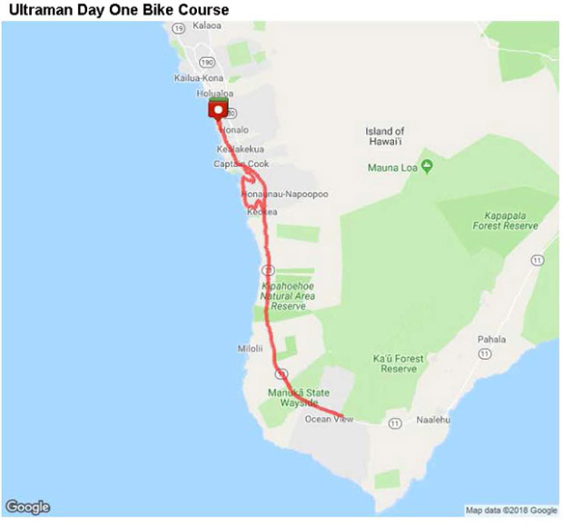 In a nod to the preeminence of Madame Pele’s grip on the volcanic eruptions that wiped out many roads and communities at the south end, the Hawaiian Ultraman will not lead competitors on the symbolically significant circumnavigation of the Big Island this time around. The second day 171-mile bike leg usually started in Volcanoes National Monument, descended to Hilo, rode up the Hamakua Coast, ascended to Waimea then over the Kohalas to Hawi. This time, the second day will start in Kailua-Kona, head north on the western side to Waikoloa, then head inland on the Saddle Road past Mauna Kea, drop into Hilo, join the traditional course up to Waimea, then skip the climb over the Kohalas by heading back down to the ocean at Kawaihae, and ride 17 miles of the Ironman bike course on a 600 foot climb to Hawi.