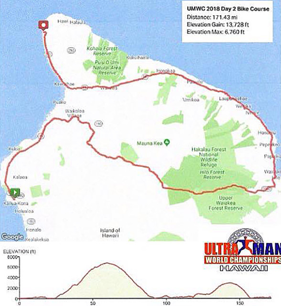 Struggling against strong winds and an adapted new course that cut a Z-pattern across the breadth of the Big Island, Tara Norton of Canada led the women’s field with a 10:27:55 bike split that was 17:53 faster than her chief rival Mary Knott of Gilbert, Arizona. Her Day 1 and Day 2 combined time was 18:44:46 which gave her a 32:50 lead on Mary Knott of Gilbert, Arizona. Cynthia Bartus of Bethlehem, Pennsylvania ride the 171.4 mile Day Two bike leg in 10:58:06 which gave her third place overall, 2:04 behind Norton and 1:31 behind Knott going into the final day double marathon.