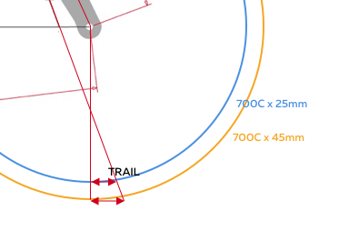 Given the wide range of tires you can fit on a gravel bike, the actual change in trail between, say, 25mm road tires and 45mm gravel tires can be quite significant. For a bike with a fairly standard 72deg head-tube angle running 700C wheels, the change in trail between those two tires is (depending on rider weight) approximately 5mm. That's significant. This is also why, I suspect, that most gravel bikes don't list a trail number (that I have seen); it just varies too much with tire size.