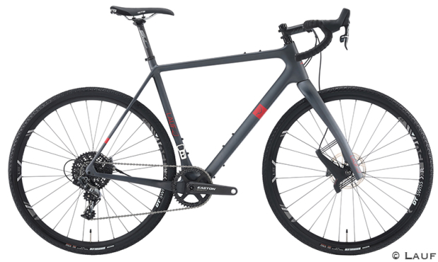 The Lauf True Grit. In size L. With a 70.5deg HTA and a fork rake of 47mm, this bike is the most "stable" of the bunch. This is basically a hard-tail 29er with drop bars. This is what I rode for Kanza, and I think it was the perfect bike for that course. The suspension fork and stable geometry are a boon over 206mi of rough – but mostly straight – roads.