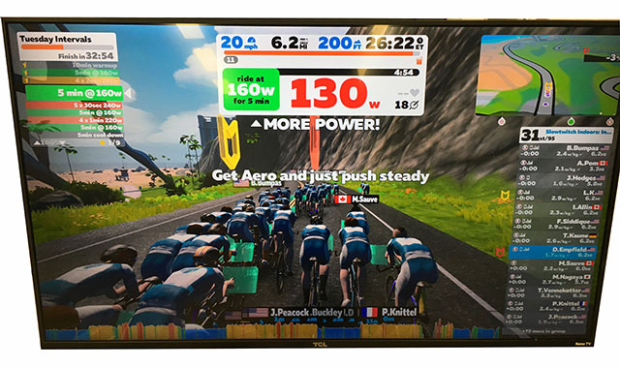 There are two ways to do this. I always have Zwift, the program – AKA “The Game” to seasoned Zwifters – running on a particular computer, which has been my Apple MacBook Air, then changed to a Windows 10 laptap, and just last week I started running it on a new 4k AppleTV. The two screenshots above I took using the camera on my iPhone, while pedaling. They're of a new 43" big screen smart TV (sounds expensive but I bought it for under $300 at Best Buy) running The Game loaded onto AppleTV ($179 at Best Buy).