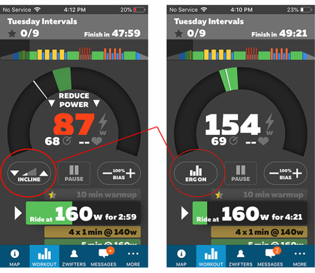 Then, just above, there are two screenshots from my iPhone, side by side, running the Companion App. There’s a blue navbar menu across the bottom, and in the “Workout” pane, that’s where I click ERG Mode on and off. In the screenshot on the left, you can’t find ERG Mode. That’s because it’s off; you see “Incline” there (more on that some other time). The screenshot on the right is what you see if you click where it says “Incline”. If you click there, “Incline” is replaced by “ERG Mode” and now you’re in ERG Mode.