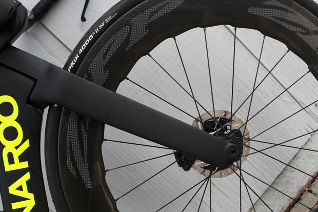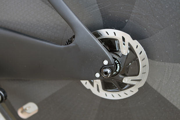 In the back behind the massive QR chainstay the Shimano Dura-Ace hydraulic disc is almost out of sight.