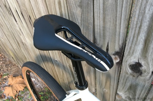 The fit and finish of the saddle are top-shelf. With stainless rails and the flashy carbon base, my test sample weighed in at 202 grams – 8 grams less than the quoted 210 gram weight.