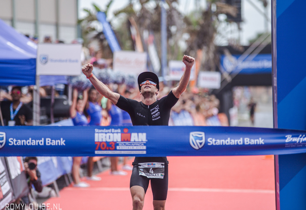 Bradley: After a shortened swim I exited the water in 4th position only seconds off the lead but a mere 30 second lead on Matt Trautman who was the defending champion and pre race favorite! After a sloppy transition Matt had all but closed the gap and we turned onto the first climb together. For those who know the course East London boasts a pretty epic bike route heading inland on our countries second larges highway, the N2. For 45 km you are faced with relentless rollers each seemingly steeper than the previous. The Easterly wind had now picked up nicely and afforded us athletes a gentle helping hand up the endless rollers ahead. As a smaller athlete I knew I had to take advantage of these climbs and my strategy was simple, build up as big a lead as possible on the way up and try to survive back down into a stiffening easterly! The strategy paid off and coming into T2 I had a lead of roughly 2 minutes on a group including Matt Trautman and James Cunnama about a further minute adrift. My run legs were strong but not amazing. I am still struggling to back up a really hard ride with a solid half marathon but definitely improving with each race is encouraging. The defending champ was on an absolute mission and at the 8 km mark he had closed the gap and we were now running stride for stride. I was sure Matt could not hold this pace and thankfully entering the second lap of the run his early efforts began to take their toll and slowly the gap started opening again. Crossing the line I was over the moon with my maiden 70.3 victory and punching my ticket to the Ironman 70.3 World Championships was the cherry on top!