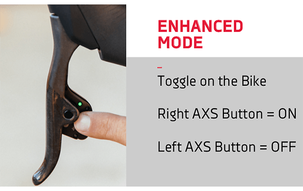 Nevertheless, I rode a bike for a day in Sequential mode and it worked… well… move over to my review of SRAM’s new drive train options and you’ll see. There’s also Compensating mode, which lets you make the affirmative act of a front derailleur shift, but it then shifts the rear derailleur automatically up or down a cog or 2, to place you in the next larger or smaller gear. Then there’s manual mode. The AXS app is where you choose the mode, though it’s also possible to turn the mode on an off on the bike, even while riding (as is illustrated in the image below).