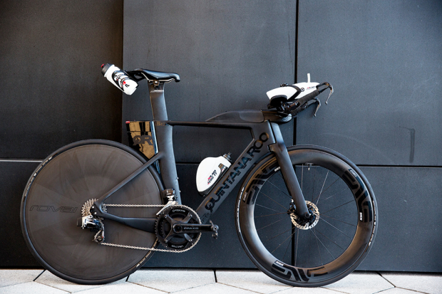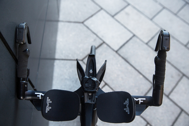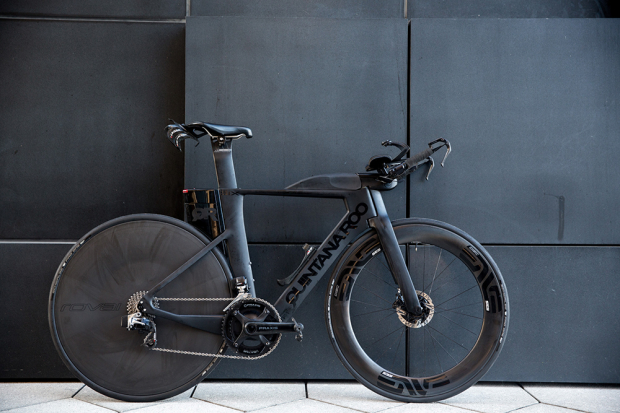 The black on black Quintana Roo PRsix Disc looks very mean and fast just sitting in place here. The saddle to pad drop for Hovda on this 52cm PRsix is 14.5 cm.