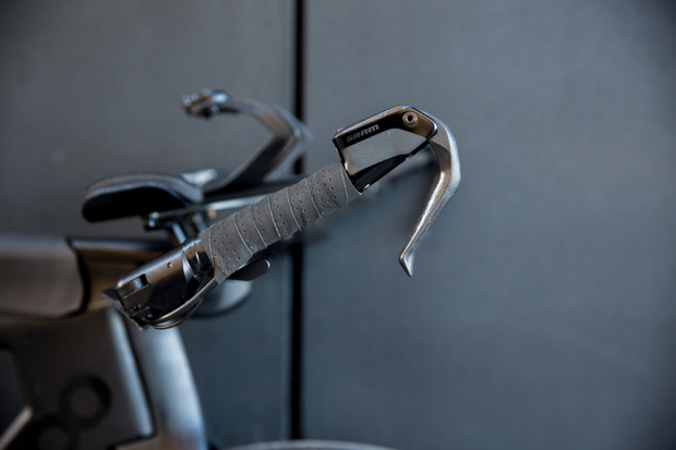 Up close with the bars folded back, and the SRAM Red eTap brake lever.