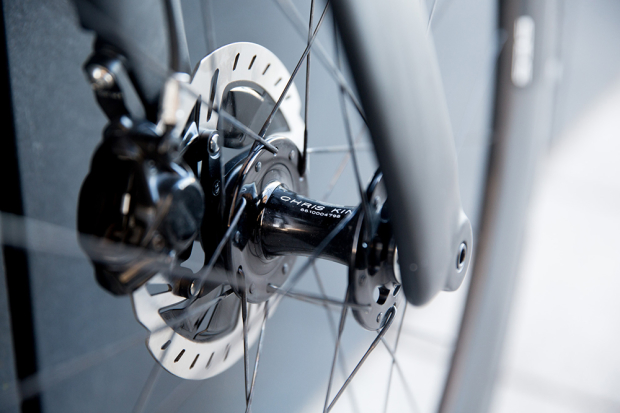 Up close with the front disc brake of this Quintana Roo PRsix.