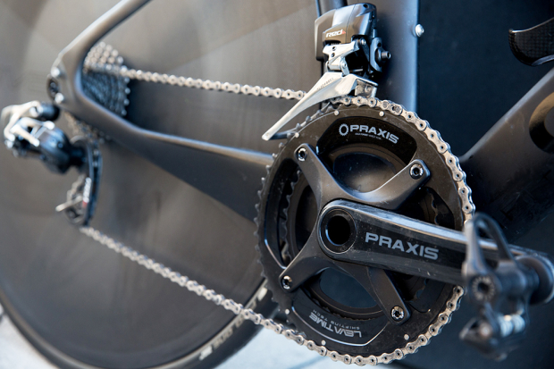 Allan Hovda rides on 170m Praxis Zayante carbon cranks with 53/39 Praxis Cold Forged X-Rings. The chain is treated with a CeramicSpeed lube and the pedals are Assioma Duo Power.