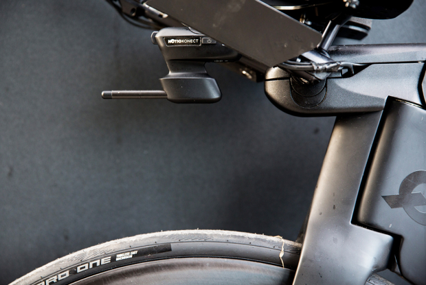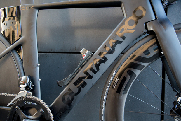 The QR PRsix is gaining in popularity as a fast frame that is easy to deal with. All waterbottle cages on the bike are by the US brand XLab. The front ENVE SES 7.8 tubeless wheel is laced with a a 25mm Schwalbe Pro One tubeless tire.