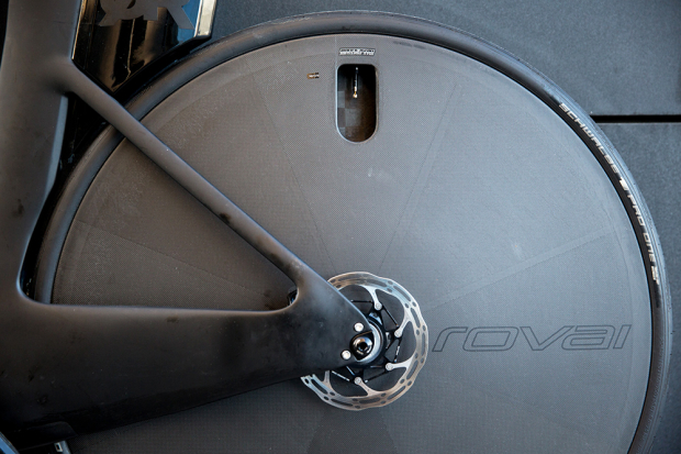 The Roval disc wheels is laced with a 25mm Schwalbe Pro One tubeless tire.