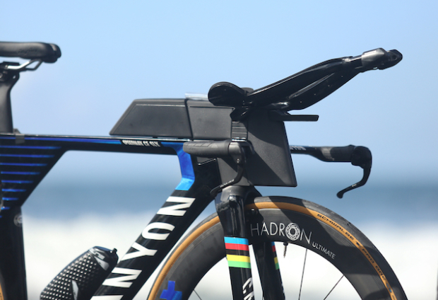We saw Patrick Lange aboard a similar design last year. Not quite the same. But similar in this way: The pressure on his arm was lessened because it was displaced across the entire forearm. Above you see the images of Campenaerts' Ridley and Lange's Canyon Speedmax, each with their bars that incorporate this basic idea.