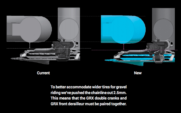 The chain line on the 2x groupsets has been pushed outboard by 2.5mm. I’m going to need to wrap my brain around whether I like this. But I don't typically come out ahead when I question Shimano on shifting performance.