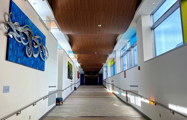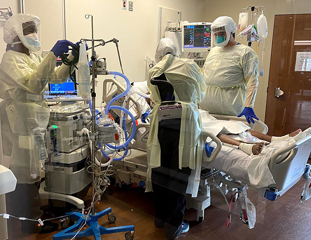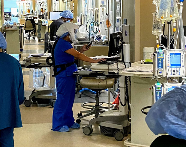 [PHOTO: Unrecognizable bodies in PPE suits, IV pumps, crash carts, central line carts, computers, x-ray machines, etc. These hallways are typically clear, with the exception of computer work stations.]