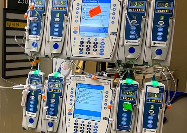 [PHOTO: Below is a typical infusion load for intubated COVID patients: blood pressure support, IV fluids, analgesia, sedation, paralytic, antibiotic infusion, etc. Pumps have been moved to the hallway so adjustments and changes can be made while minimizing exposure.]