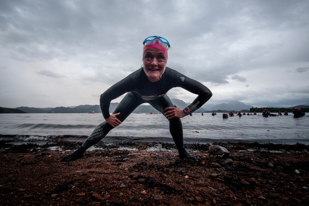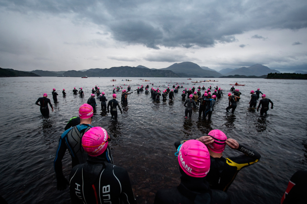 A little bit of stretching before getting into the cold waters of Loch Shieldaig. Pink swim caps for all in this race to be easily seen by the support crews.