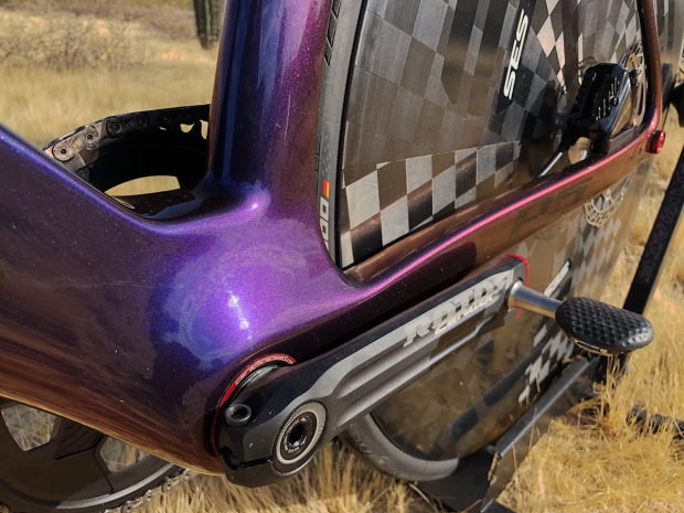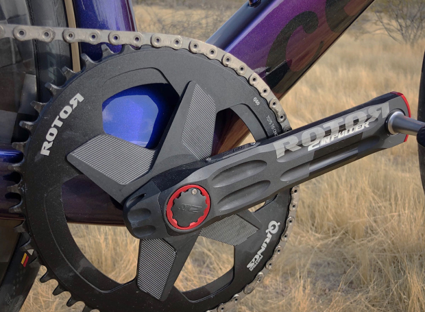 The 172.5 mm Rotor 2inpower 1x crank set with a 50 tooth direct mount chainring is connected to a SRAM Red Etap AXS 12sp rear derailleur and a SRAM Red Etap AXS 10-33 12 speed cassette and modified Speedplay Zero Aero pedals.
