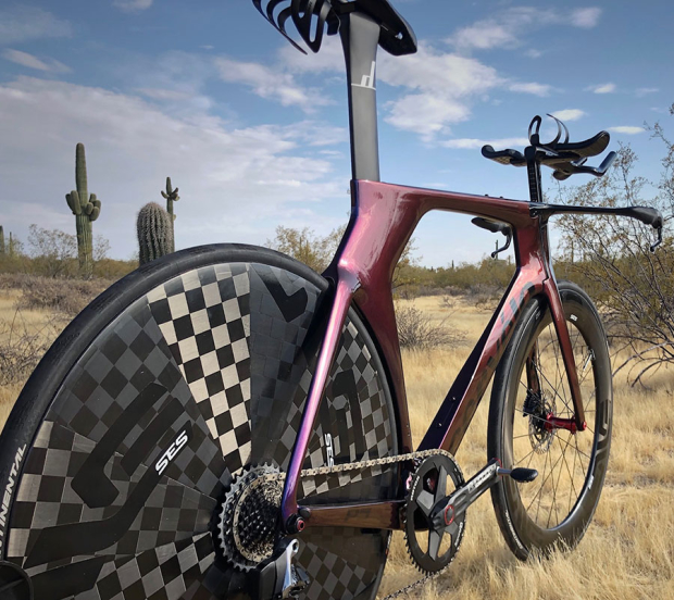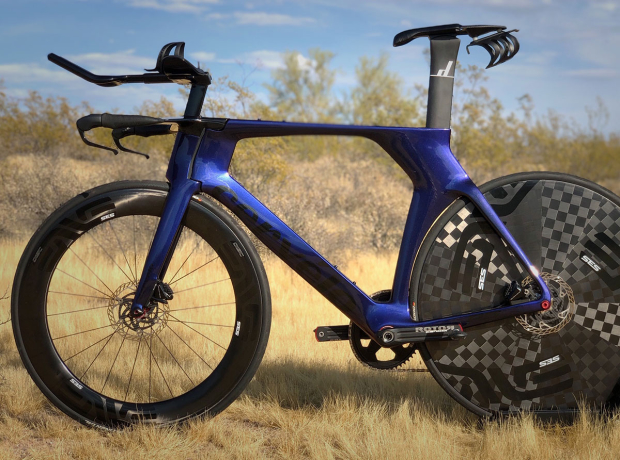 As the bike sits with the race wheels and disc brakes, this Cervelo P5 disc only weighs 18.04 pounds. Wheels on this bike are ENVE SES Disc plus a 78mm ENVE SES Carbon Clincher with an Industry 9 hub and ceramic bearings. Miller is 45 years old, 6'3" tall and weighs 230 pounds, and prefers the 70.3 distance. But with this new UCI legal ride he might also attempt some road TTs.
