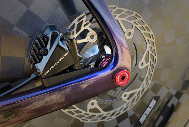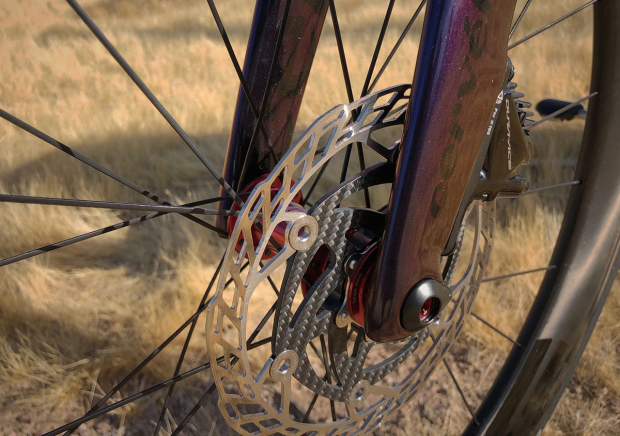 Up close with the front Carbon-Ti X-Rotor 160mm rotor with an Ashima 6 bolt to center lock adapter, and the Shimano Dura-Ace brake calipers. The thru axle is a Carbon-Ti X-Lock.